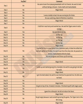 Just like the original spreadsheet created by a husband, this one detailed all of the times in a 30 day period that the wife initiated or indicated her desire for sex with her husband and all of his excuses or ways he turned her off.